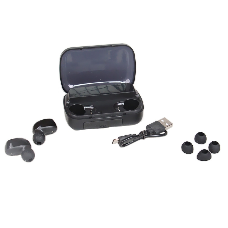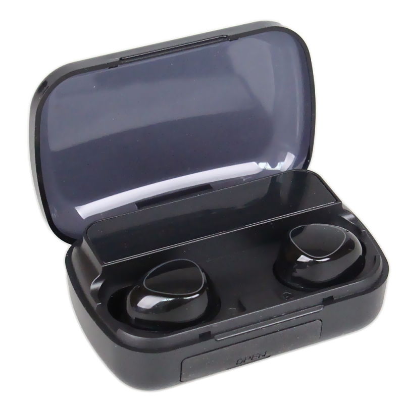 Vezeték nélküli Bluetooth fülhallgató töltőtokkal.