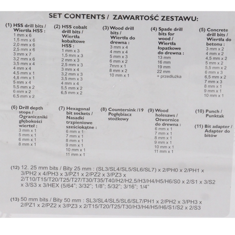 - Lapos fa fúrószárak: 13 mm, 16 mm, 19 mm, 22 mm + hosszabbító